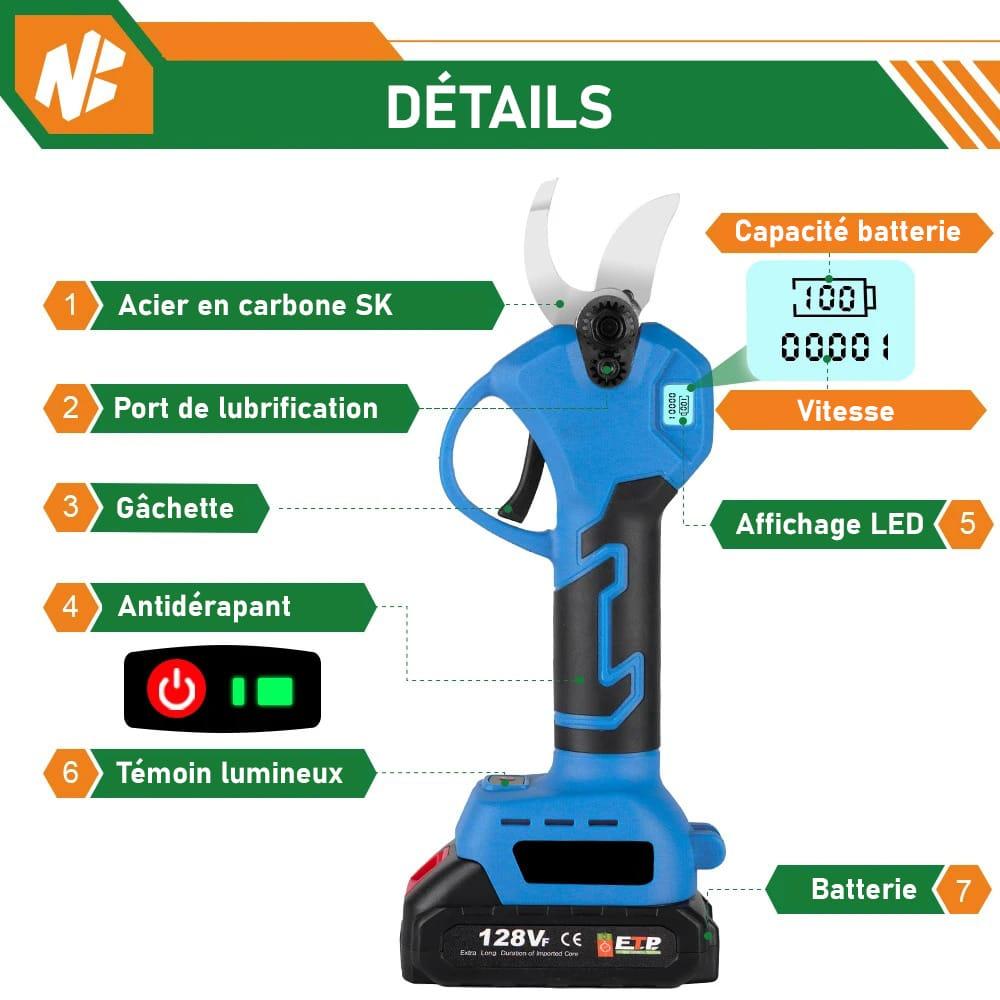Équipé d’une batterie au lithium-ion 128 VF de 7500 mAh, ce sécateur offre jusqu’à 3 heures d’utilisation prolongée avec une charge complète en moins de 2 heures. De plus, la batterie est facilement remplaçable et compatible avec de nombreuses marques sur le marché, pour une polyvalence maximale.
