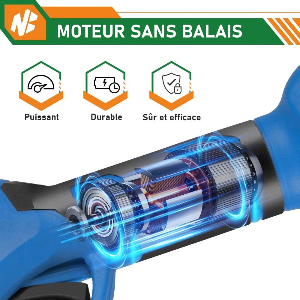 Grâce à son moteur sans balais de 1280W, ce sécateur électrique offre une puissance exceptionnelle tout en prolongeant la durée de vie de l’équipement. Vous bénéficiez ainsi d’une performance fiable et durable, sans friction ni chute de tension, pour des coupes efficaces à chaque utilisation.